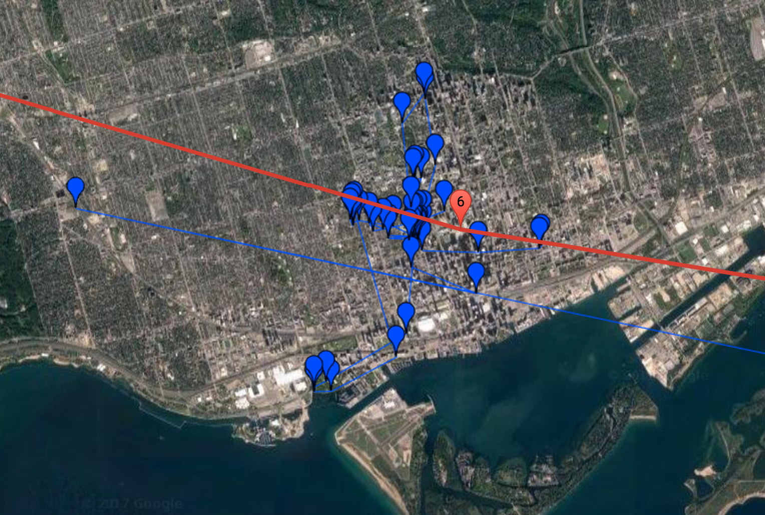 Here's how it looks when we zoom in on an area with tracking data (Toronto, which is where I am right now):