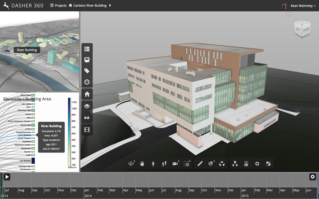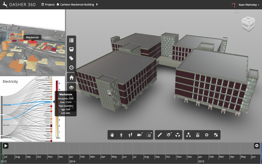 The various views – between the campus overview at the top-left of the screen, the Sankey diagram showing (for now) the use of different power sources on the campus, and the traditional Dasher 360 window on the right – coordinate nicely: selecting nodes in the Sankey diagram results in the 3D model being highlighted and selected, and double clicking on either will cause the BIM to be loaded inside the main view.