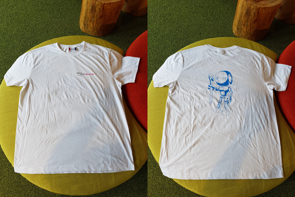 The second comes from the first Design Night Switzerland held at the end of 2016. The theme for this event was robotics, so there's a picture of a robot on the back. the T-shirt is white and of size XL: