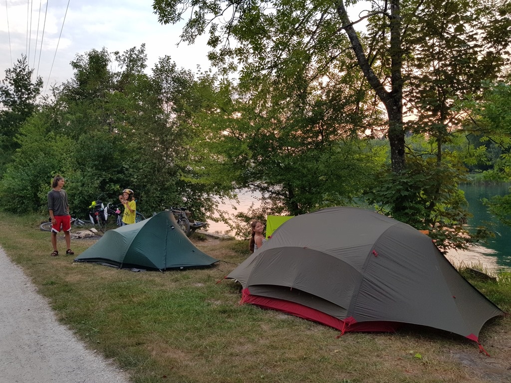 We ended up fighting a couple of fierce inclines (by the side of a lake, no less!) so made much slower progress than Google Maps had predicted. (This did help us recalibrate expectations for the rest of the week's cycling, though, very importantly.) As our 8pm check-in deadline (the closing time of the original campsite's reception) was fast approaching, we settled for a different – but very nice – campsite a few clicks short of it.