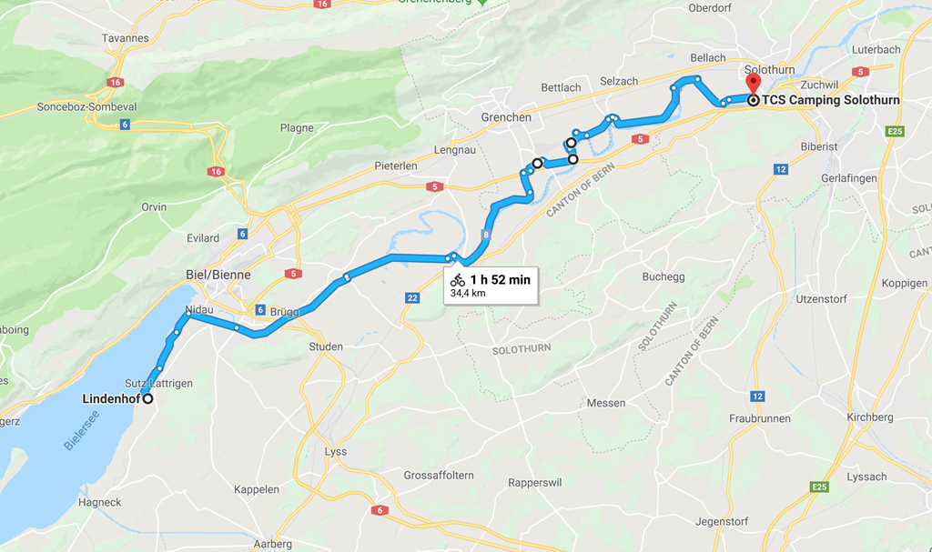 Our aim for the first day was fairly modest: to go from our home to a campsite on the shore of the Lac de Bienne.