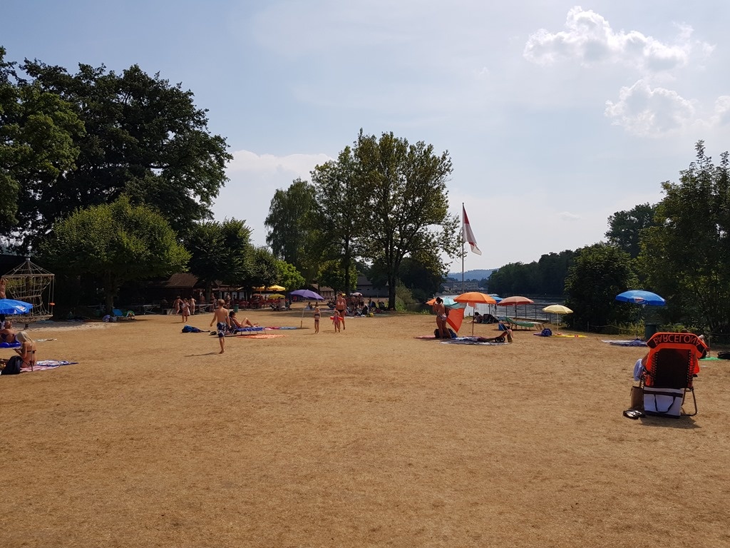 Some of the journey towards Brugg was a little boring – as it deviated from the path of the river – but we made good progress. We chose not to stop in either Olten or Aarau – these are easy day-trips by train from where we live – and rather choosing to stop in Schönenwerd at an extremely parched – almost Ballardian – swimming pool for the kids to cool off in.