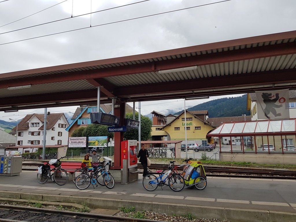It's quite easy to take the train with your bikes, in Switzerland: you just need to buy a supplemental ticket (which was 15 CHF per adult per day with our half-price travelcards) and then find a train that can accommodate the bikes. This proved pretty easy – at least getting to Winterthur – apart from the fact we had the two trailers to deal with.