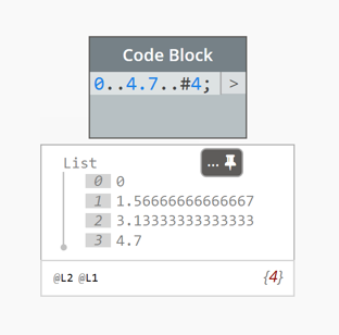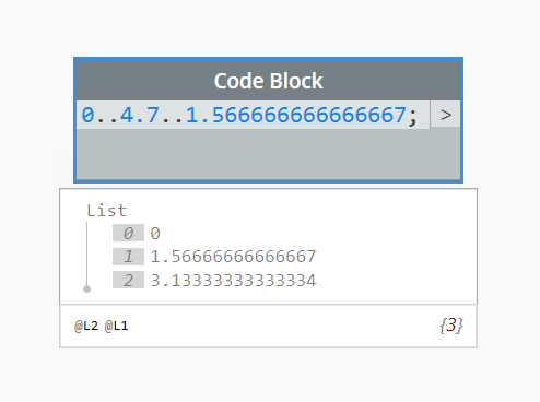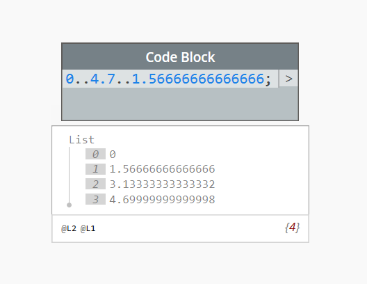 [Update: Jacob Small pointed out I can use a # within the DesignScript range to specify the number of bands, rather than the increment. This is much cleaner: 0..4.7..#4.
