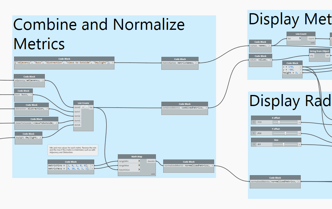 In the last post, the subgraph that generates text for the metrics and the radar chart as geometry – both to the right of the image – was hardcoded to the exact metrics we were dealing with. To make it easier to add new metrics – as well as to be used with different metrics in another graph – I refactored that section of the graph to be more flexible and accept a list of metrics along with information on whether they're to be minimised or maximised by Refinery.