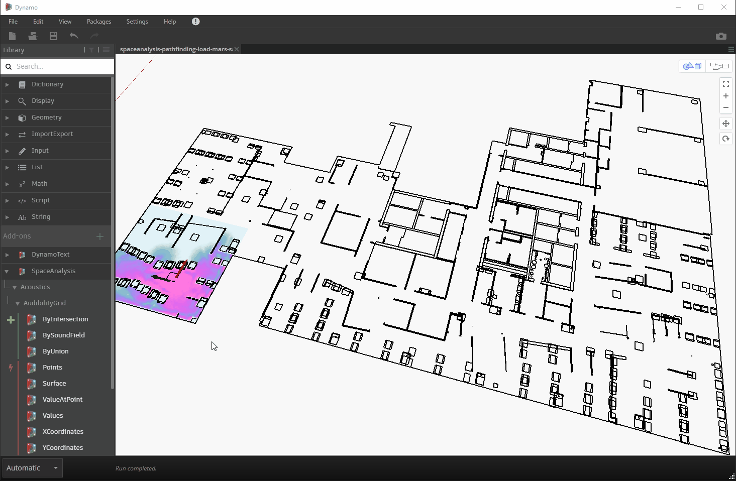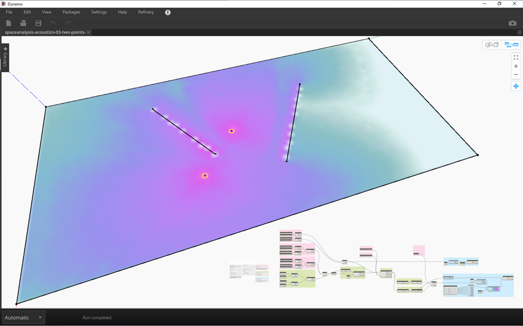 You heard right. Somehow our resident simulation hero, Rhys Goldstein, has found a way to approximate acoustic analysis using the same fundamental data structures he used to implement both pathfinding and visibility. Simon Breslav has built the core C++ library into the Space Analysis package and has posted it to the Dynamo Package Manager as version 0.3.0.