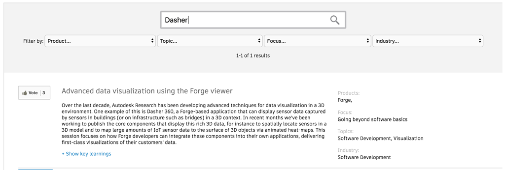 I've submitted two, this year. The first is about how Forge developers can build their own products using components we're publishing from the Dasher 360 codebase. You can find the class by searching for "Dasher", even if the class is about more than that.