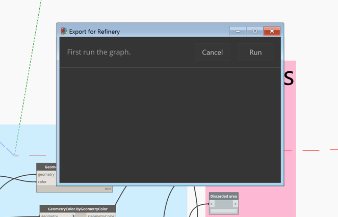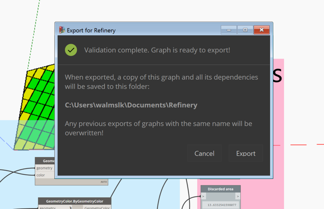 To understand what has happened during the export process, you can open up "%userprofile%\Documents\Refinery" and see that it contains a copy of your exported graph, plus .Dependencies and .RefineryResults folders.