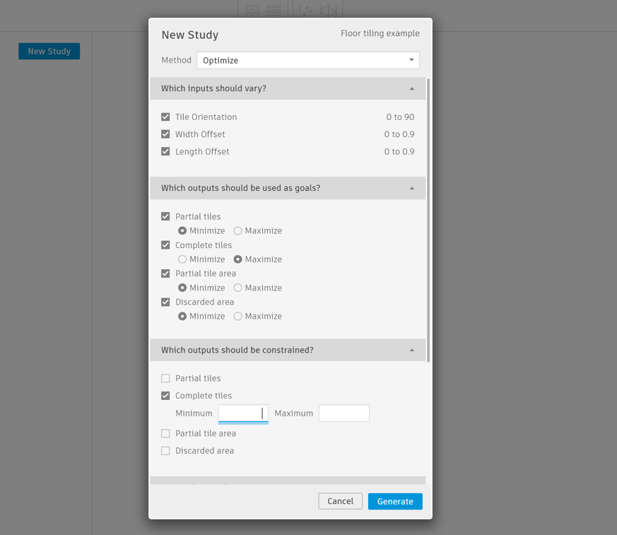 The main change – other than the streamlining, plus the ability to drive the UI without Dynamo around – is that you can now constrain outputs, should you so choose. This is particularly beneficial if you already know you want to focus on a known subset of the solution space.