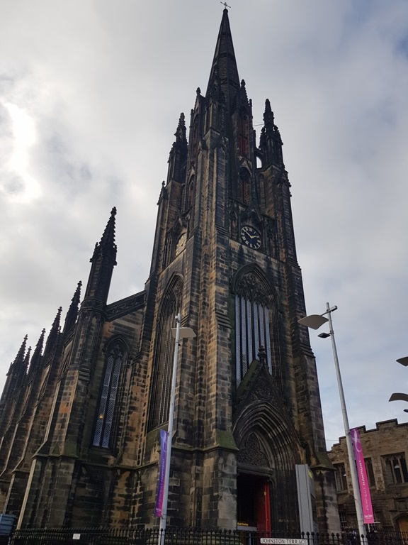 We were able to check in early to our Airbnb, thankfully. It has a lovely view from the front across the park, and an equally nice one behind across to Bruntsfield Church. The rainbow isn't there the whole time, of course.