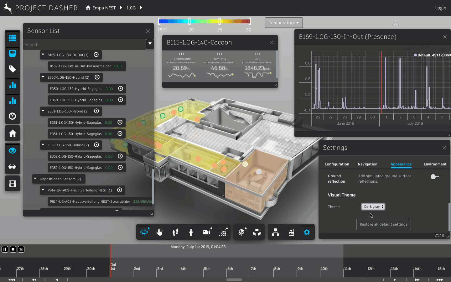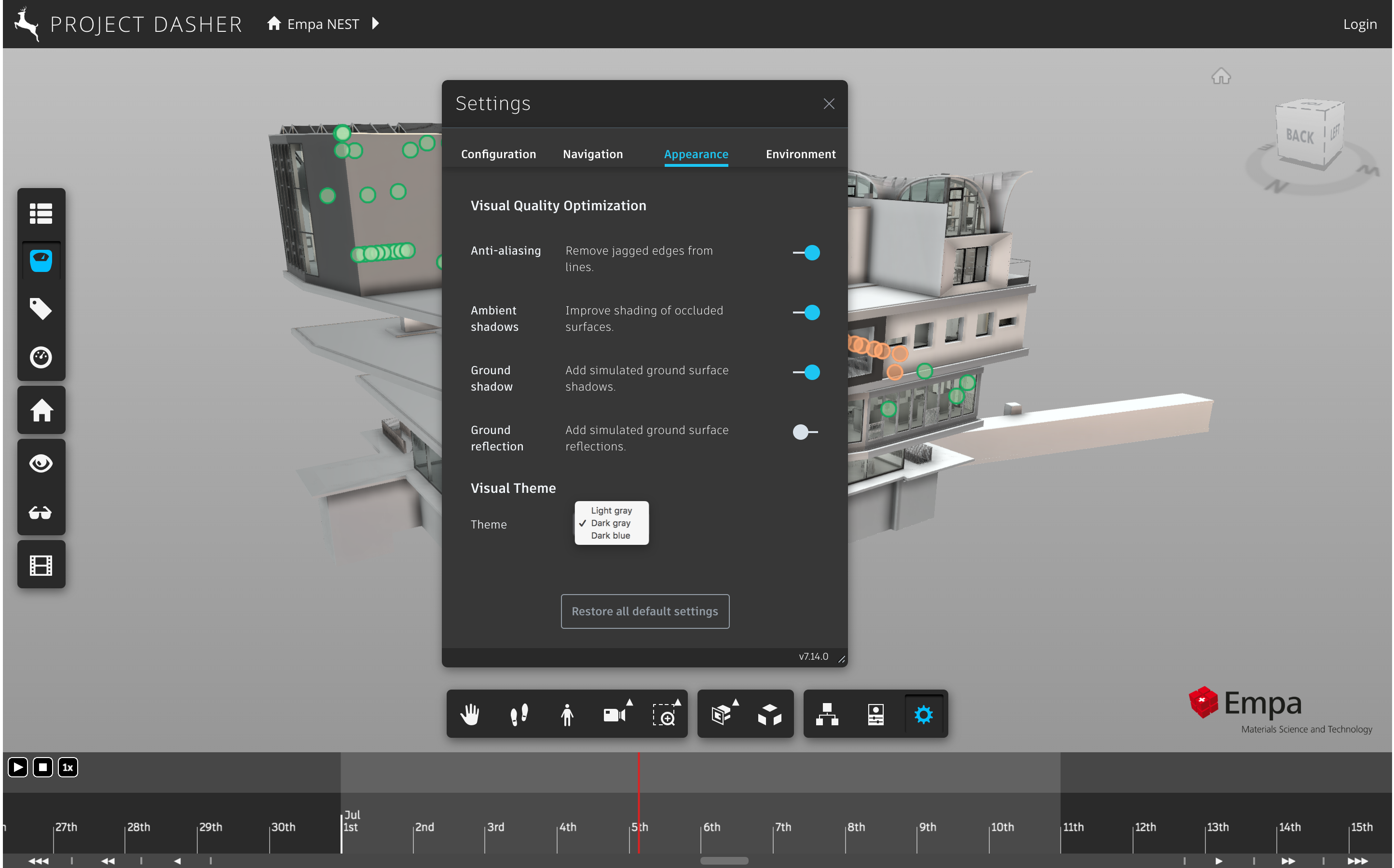 The integration into the Dasher application itself was reasonably smooth: I modified the settings dialog to add a dropdown on the Appearance tab. Changing the dropdown's selection then sets the theme, which – among other things – adds a class (whether 'hig-dark-gray-high-density', 'hig-dark-blue-high-density' or 'hig-light-gray-high-density') to the main page's body element. The relevant theming is then picked up automagically. The timeline theming took a little more work, but I'm pleased with the results: you can even change the theme while significant operations are in progress.