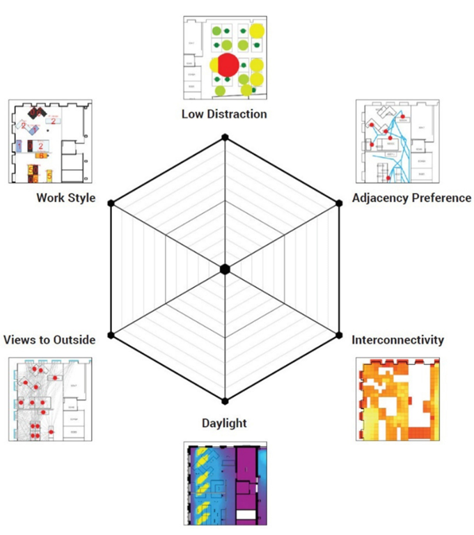 It's interesting to think that the "Buzz" (shown here as Interconnectivity) metric – intended to encourage serendipitous encounters as people use common routes through the office – may want to be minimised (rather than maximised) in our post-COVID future.