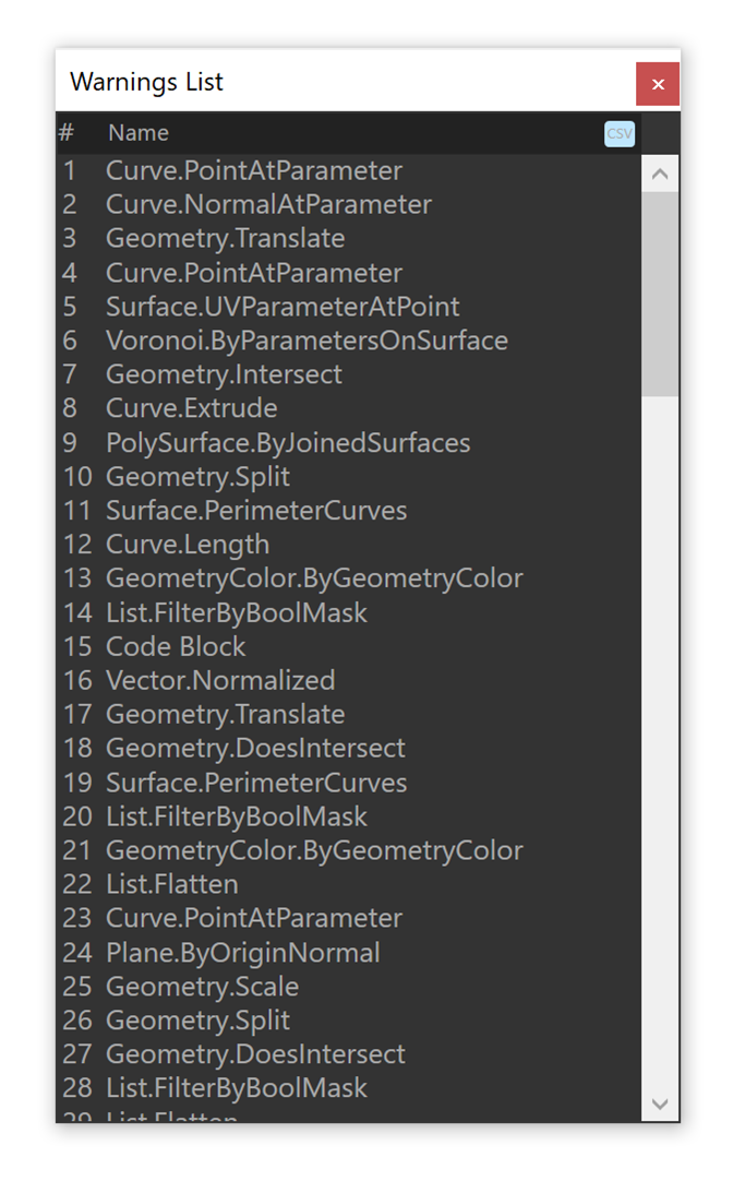 The other was to add a feature to Warnamo – a tool that lists the warnings and errors in your Dynamo graph – to let you export the error list to Excel. This is available from Warnamo 0.1.3. The UI change is very subtle – there's now a tiny button that says CSV in the dialog's title bar.