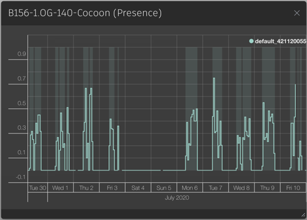 Then we can try again by looking at the Maximum values for the same time period, this time using the 1-day data resolution. We can immediately see areas that have gone full days without being occupied – and yes, this is most obvious from the dark blue coverage during weekends where the maximum Presence value for most sensors is zero.