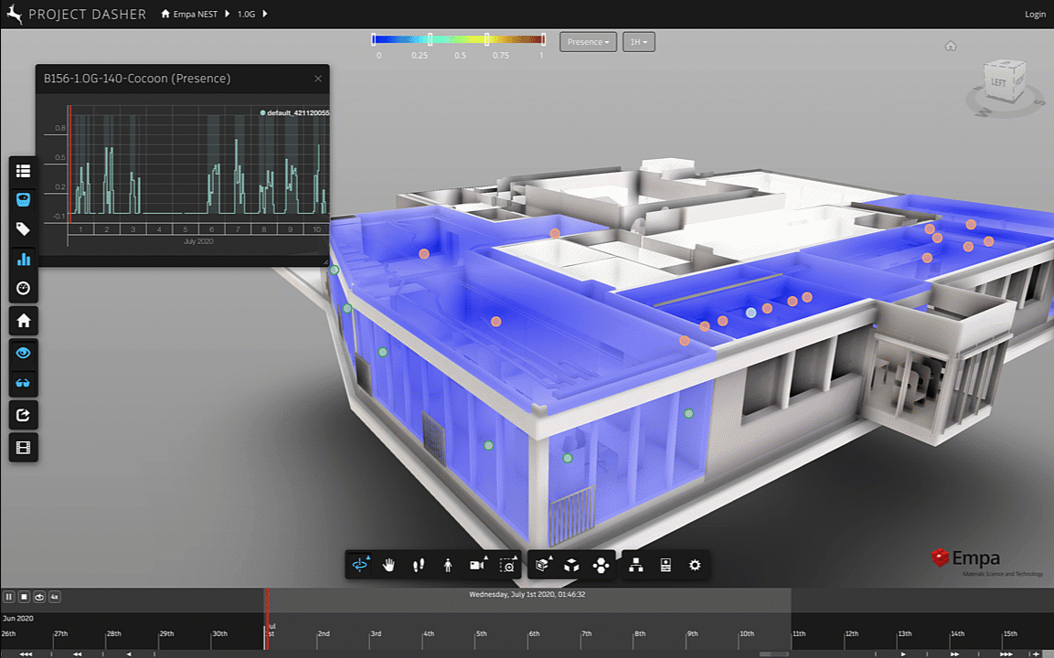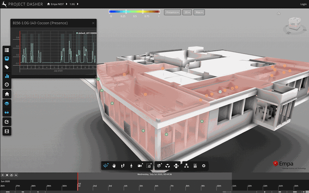 In the NEST dataset we have a number of "Presence" sensors, which return Boolean values indicating whether spaces are empty (0) or occupied (1). The raw data – which appears to have a 1-minute granularity – is simply 0s and 1s, but as soon as we get into the higher-level roll-ups (i.e. 15M and above) the values get averaged across that particular time period.