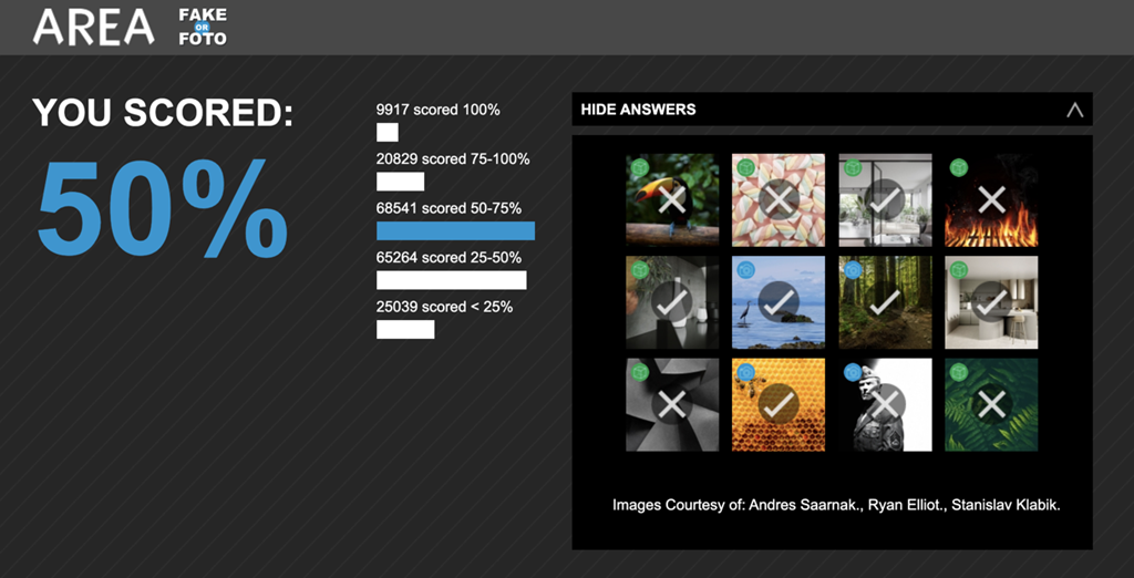 I gave Fake or Foto a try, too, it it seems I did exactly as well as an average chimpanzee would have.