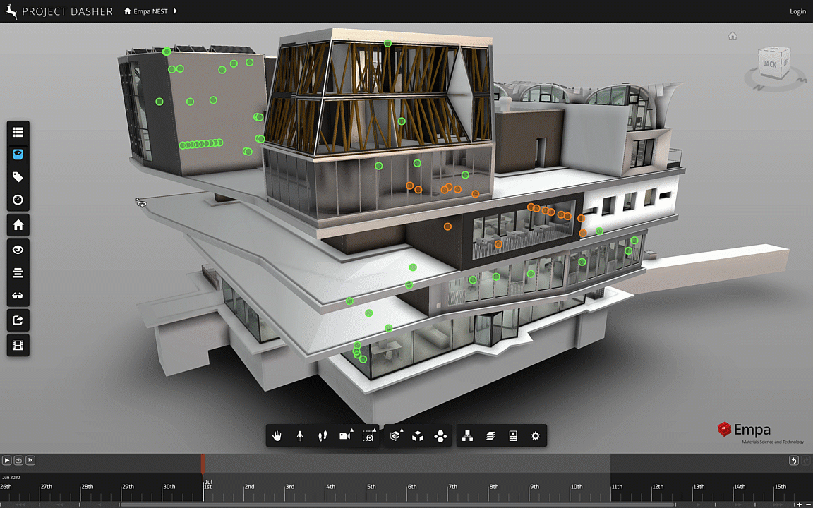 Way back when – when we first started rethinking Dasher using Forge – we used SVG elements in the DOM to represent sensors. This worked fine for a handful (or even two) of sensors, but over time it made more sense to swap this mechanism out for a stylized point cloud (which is the way Hyperion works, too). We evolved the implementation to perform hit-testing – to find out when you're hovering over sensors – via a reference image rather than raycasting. Simon Breslav and I have both talked about this at past Autodesk Universities, in case you're interested.