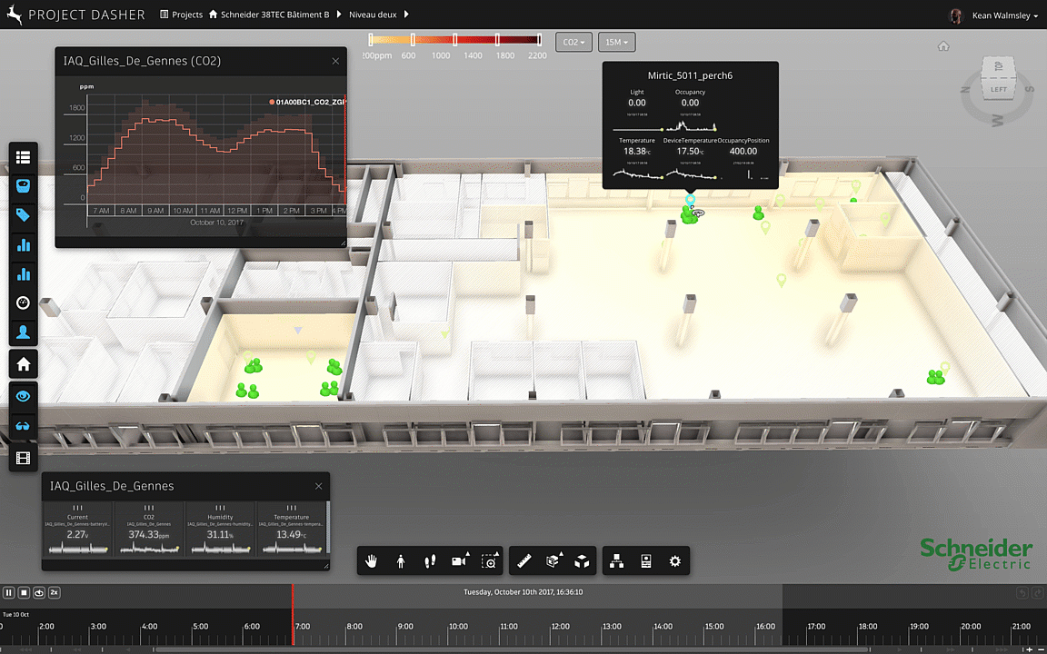 A big test of this implementation was the classic occupancy demo we developed a few years ago with Schneider Electric to display the data captured using their (then) new sensors called MIRTIC (which presumably standards for MIcro Retinal Thermal Infrared Camera?). This is still our best test of dynamic sprites inside Dasher (aside from skeleton animation, I suppose), and the Hyperion implementation worked wonderfully (the heatmaps are still based on our existing Dasher implementation, of course):
