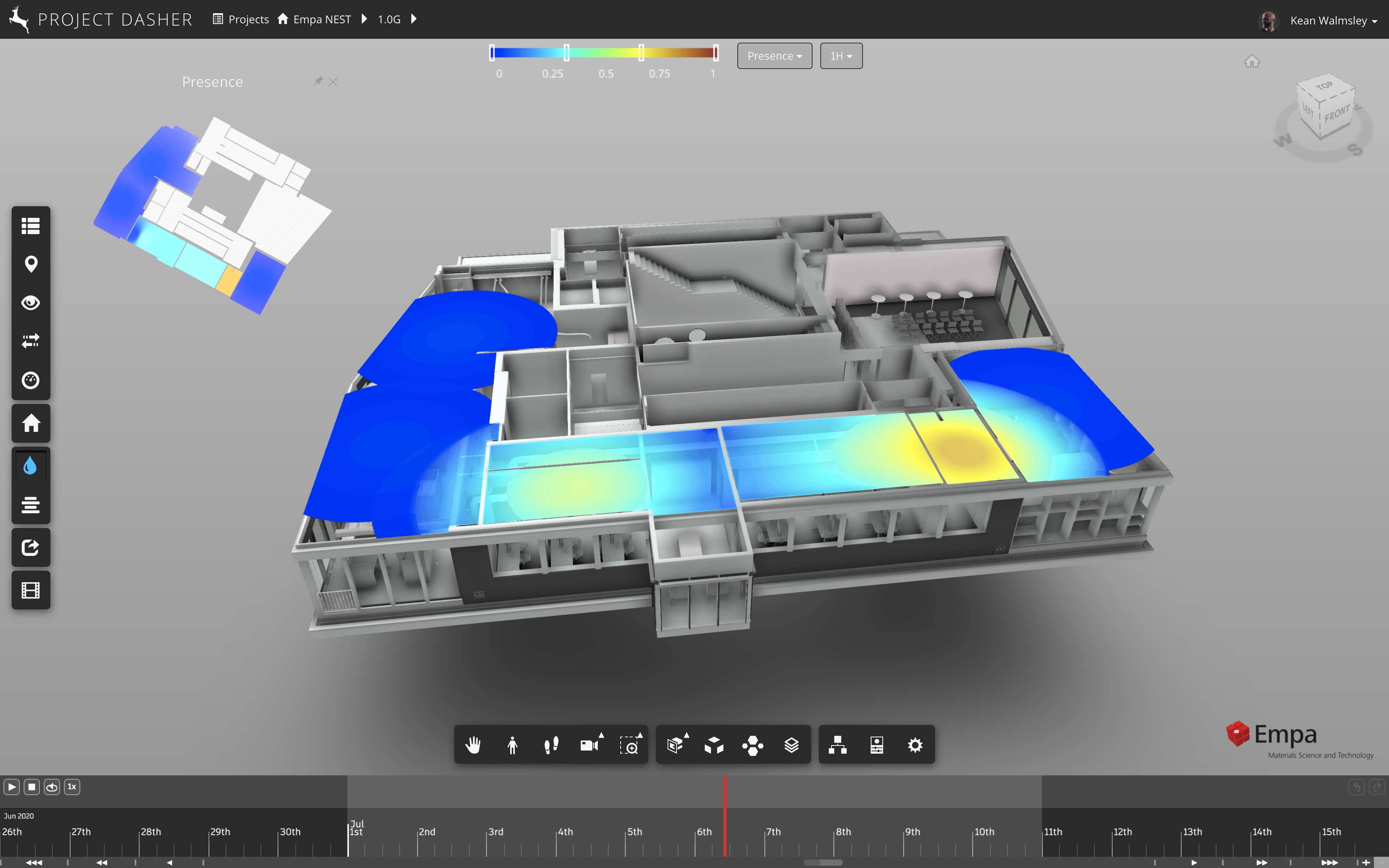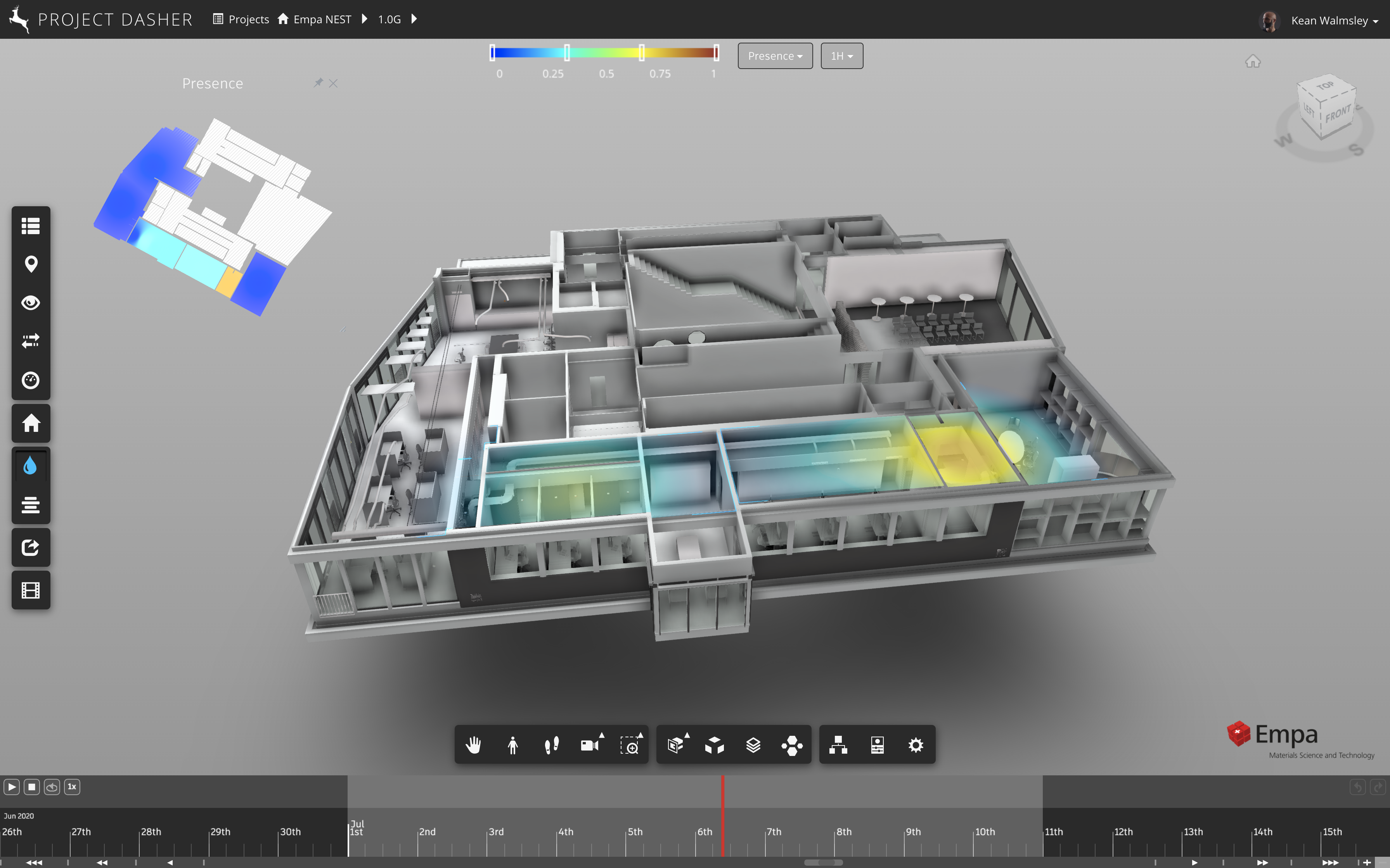 Earlier in the post I said we'd talk a little about placement of the heatmaps: currently it's possible to place them at the top or the bottom of the 3D space's bounding box. This might – depending on how your rooms have been modelled – allow you to display your data on the floor of your space (which is in many ways ideal), but this doesn't currently work for Dasher: we have to have the room volumes modelled to contain floor-/ceiling-mounted sensors, so the room volumes are typically larger than the internal spaces defined by the walls/floors/ceilings. Which also means that showing heatmaps at the minimum will lead to them being hidden beneath flooring. Showing at the maximum does work, so we're gone with this option for now. (The Hyperion team has offered to support this being defined as a 0 to 1 value – so setting placement at 0.1 would mean it would be 10% above the bottom of the space – which we'll almost certainly take advantage of, but that is something that's likely to come in an upcoming release.)