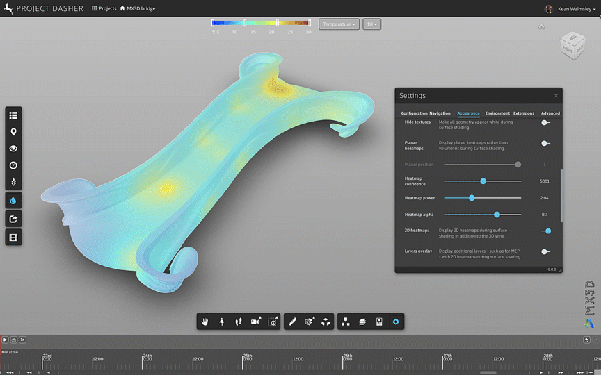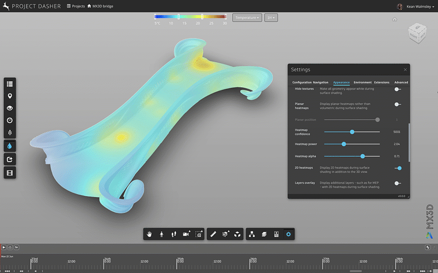What changes were needed to support larger models? Actually nothing very complicated: we mainly needed to be able to specify a larger "confidence" value for the display of sensor data. This confidence setting dictates how far data will be shown from the sensor location (in world coordinate space) before it starts to drop off. With the NEST building we typically use a value of 60, while for the MX3D bridge we use a value of 5000. (As an internal detail, we needed to increase the initial value of a shader variable to be much higher so that both larger and smaller models would work with the same logic. This has been fixed from v7.45 of the Forge viewer.)