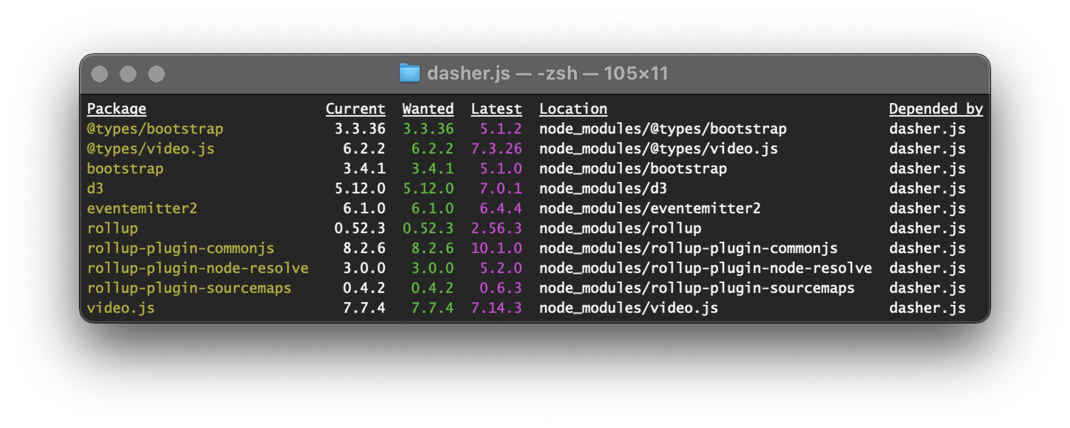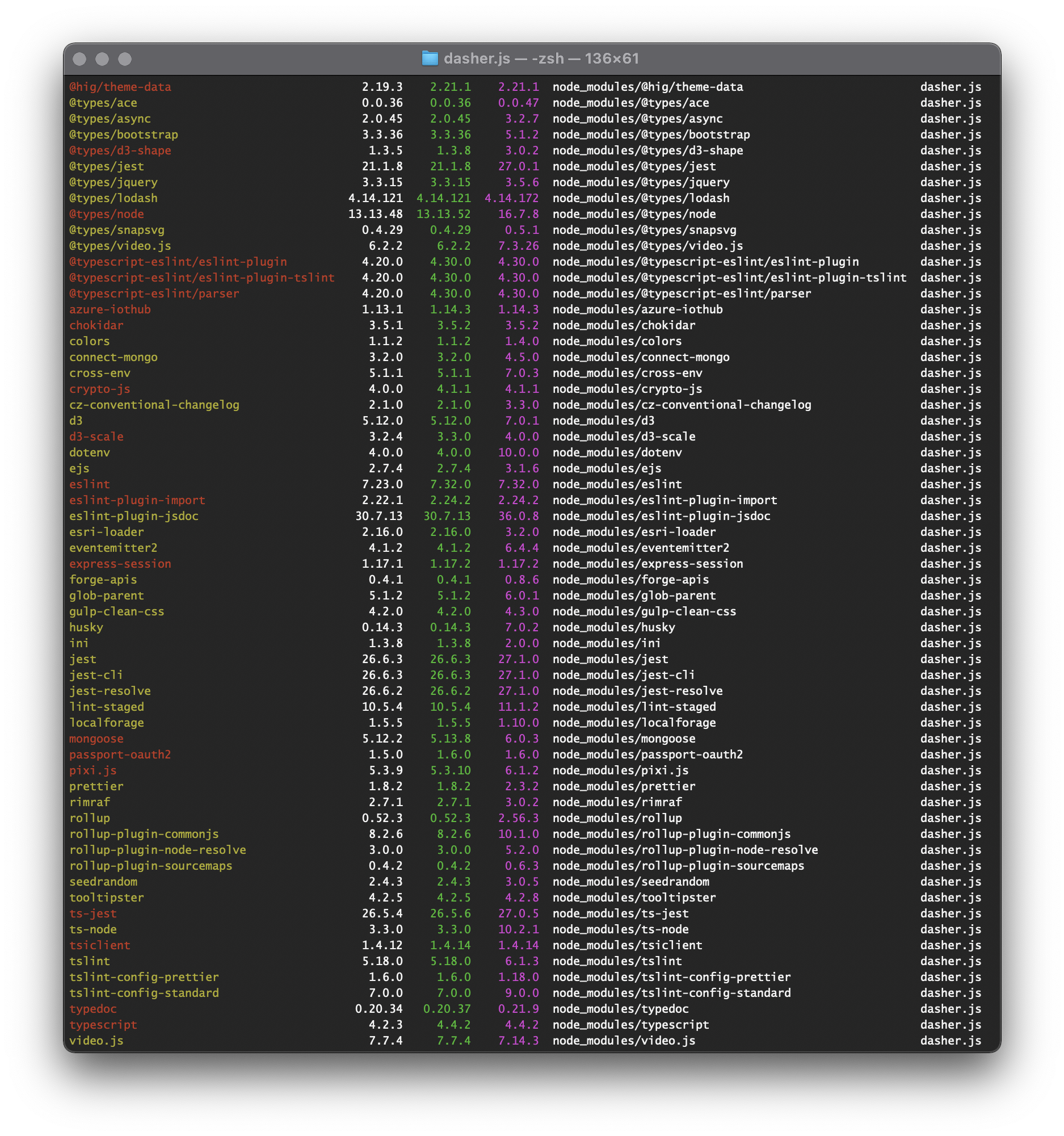When I looked at Dasher I realised it had been way too long since I'd gone through and updated some of the older components. Among the worst offenders was GridStack, which was at v0.4.0 while the latest release of that package is v4.2.6. Holy moly! But it wasn't alone… I took a look at the results of the 'npm outdated' command, and it was a vision of hell.