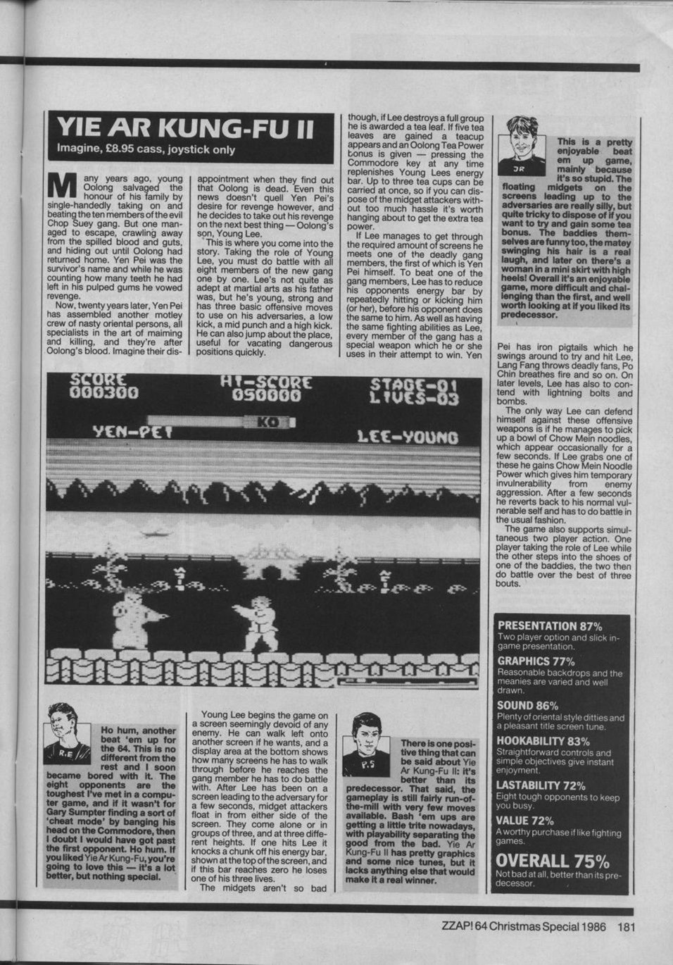 The Zzap! 64 reviewers thought Yie Ar Kung Fu II was so-so, in issue 21, the 1986 Christmas Special:
