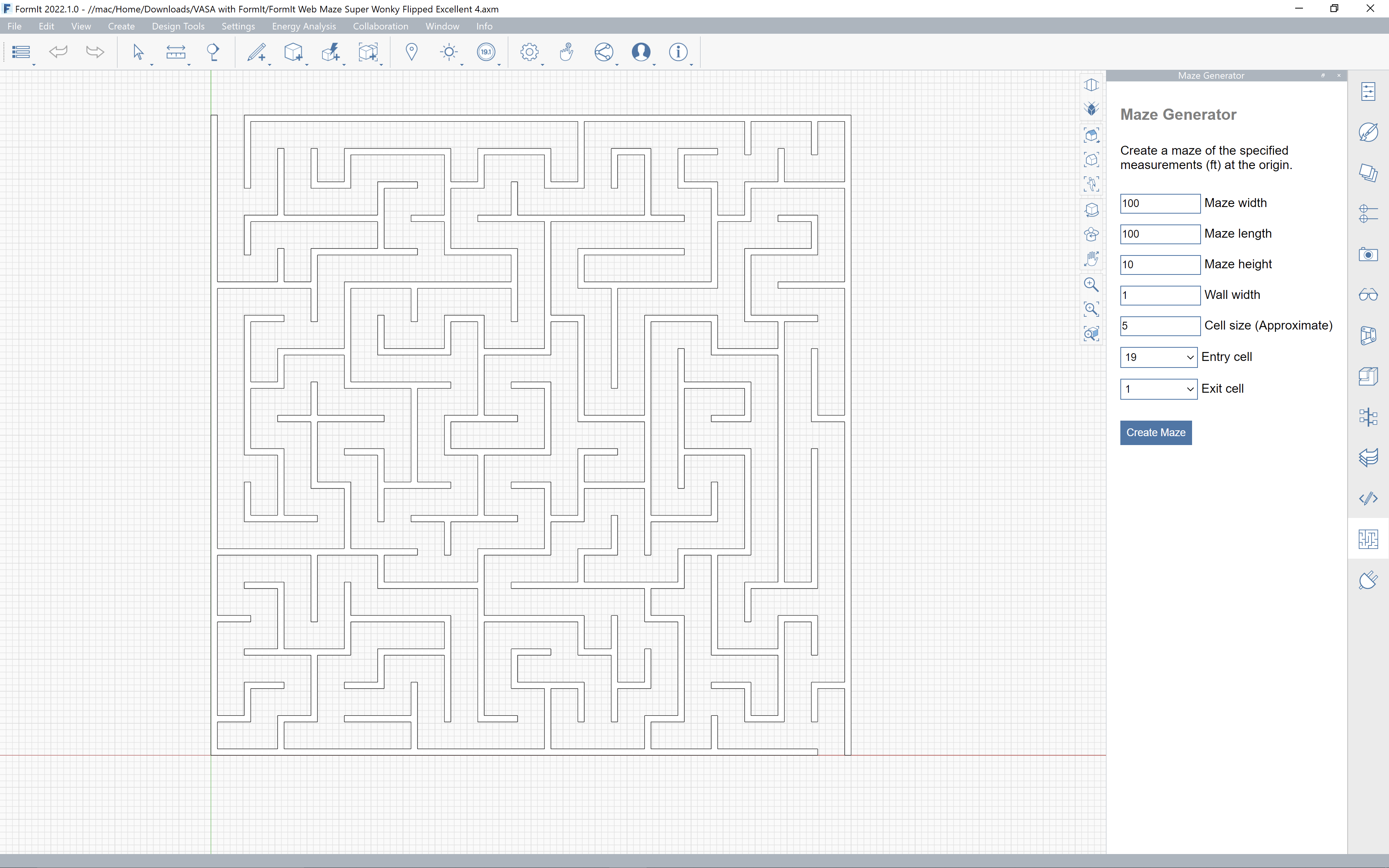 After clicking the tick (or the checkmark) you should at least start to see maze geometry inside FormIt. If you're lucky – and the settings don't need changing – then it will hopefully already show a path, otherwise you'll need to tweak the settings to match the ones specified in the UI for the Maze Generator.