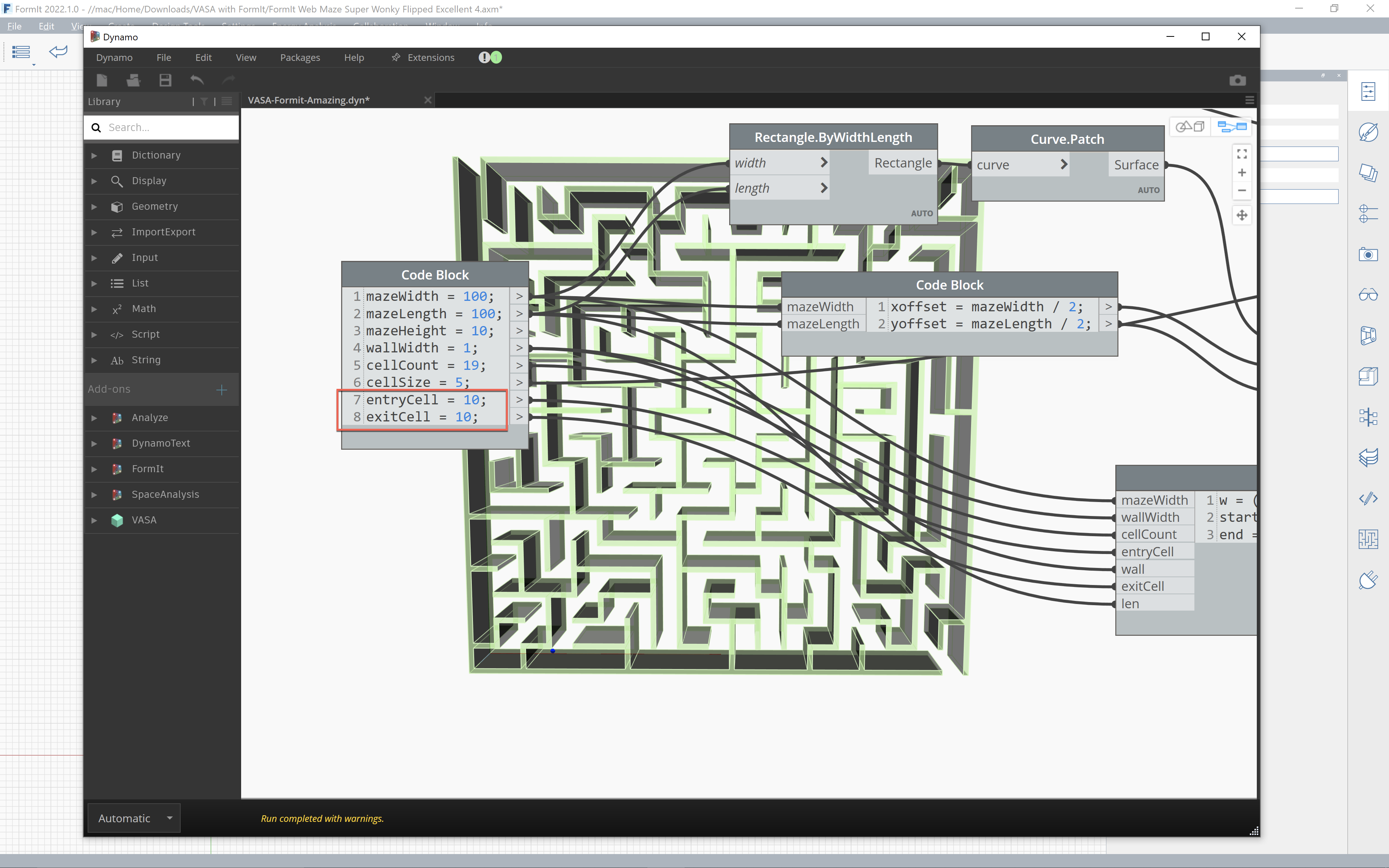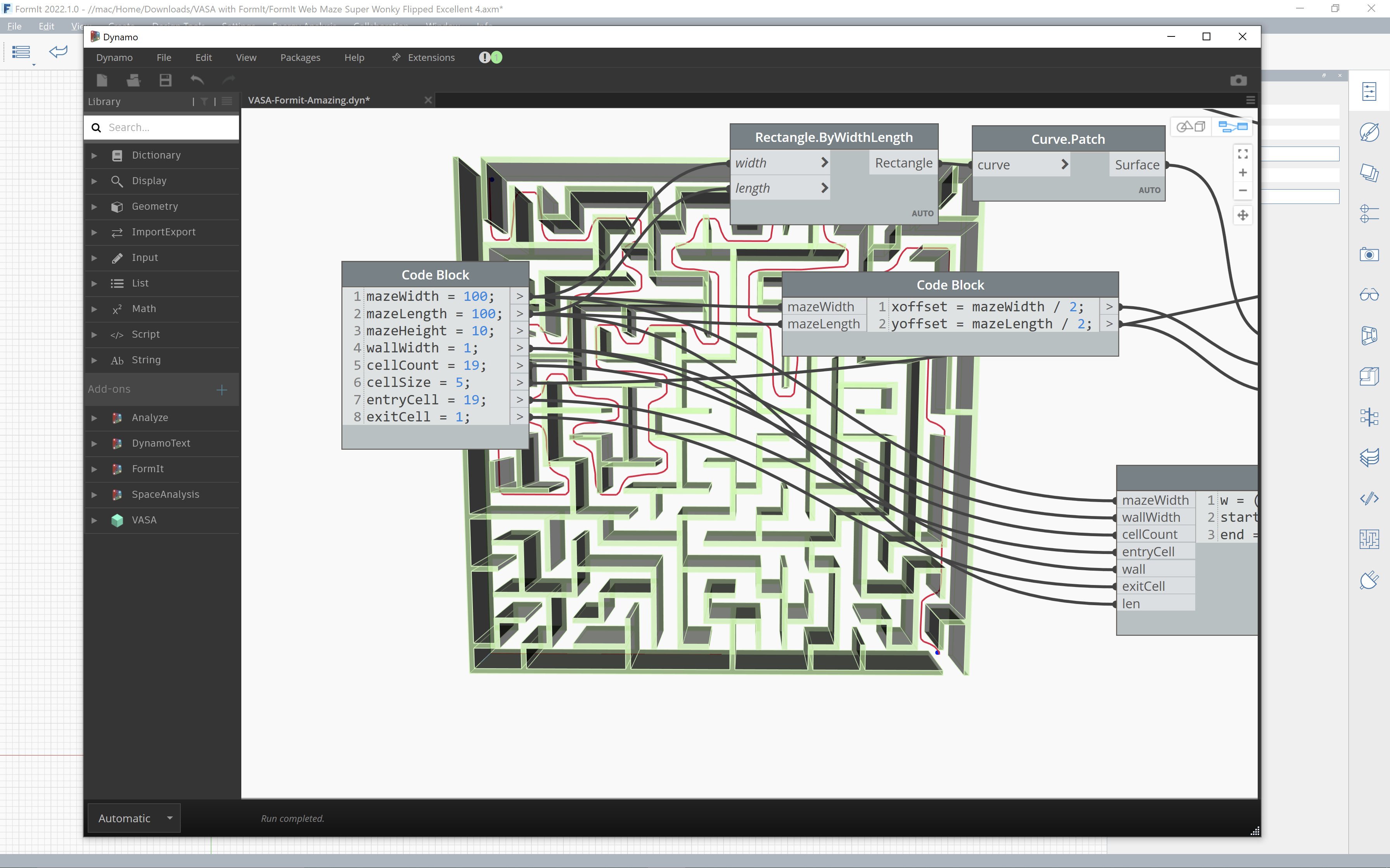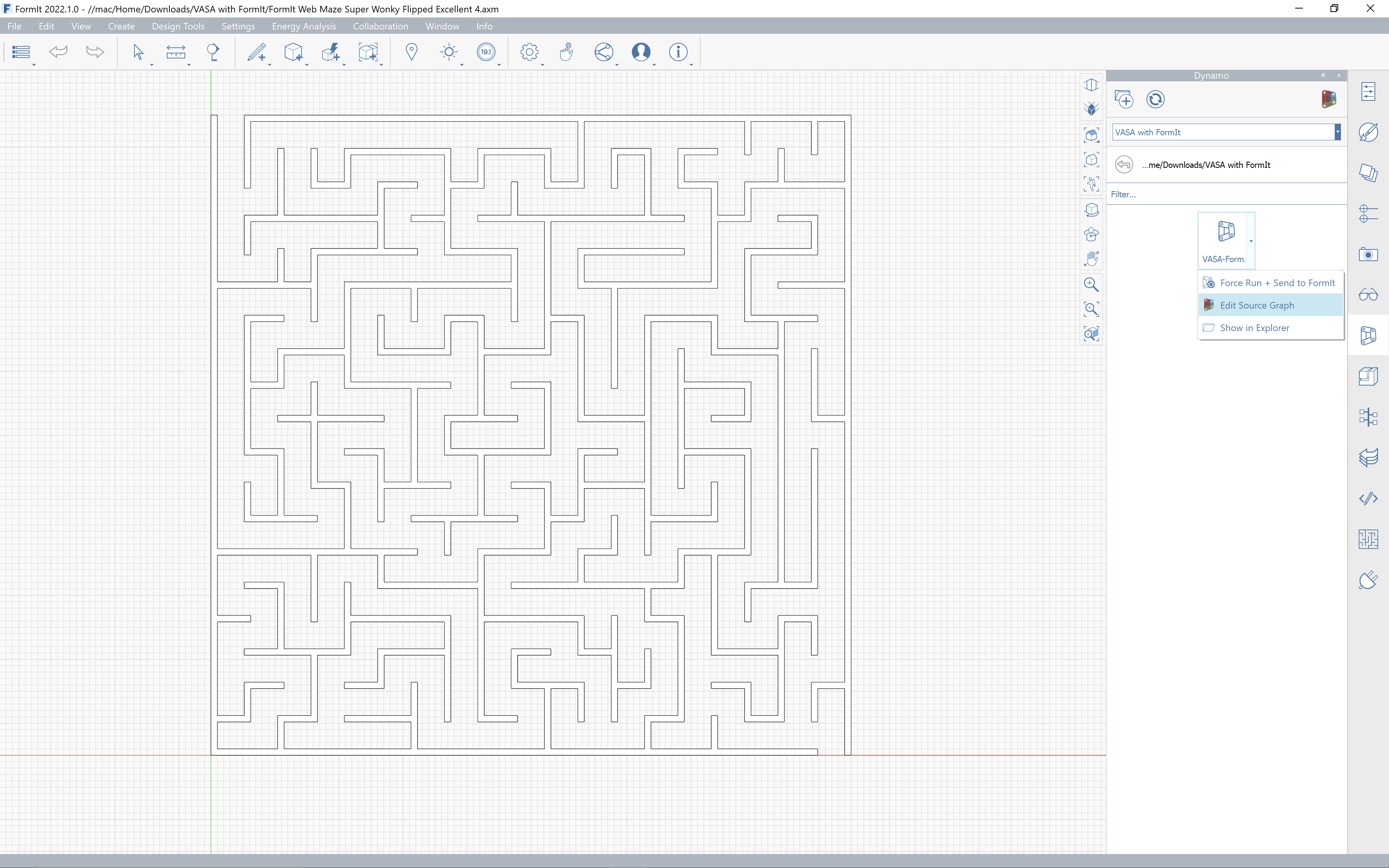In this recent post we looked at FormIt's JavaScript API and learned how Brett Garrison was able to use it to develop a Maze Generator plugin. In this post we look at one way to find solutions for the mazes generated by this plugin using VASA from Dynamo.