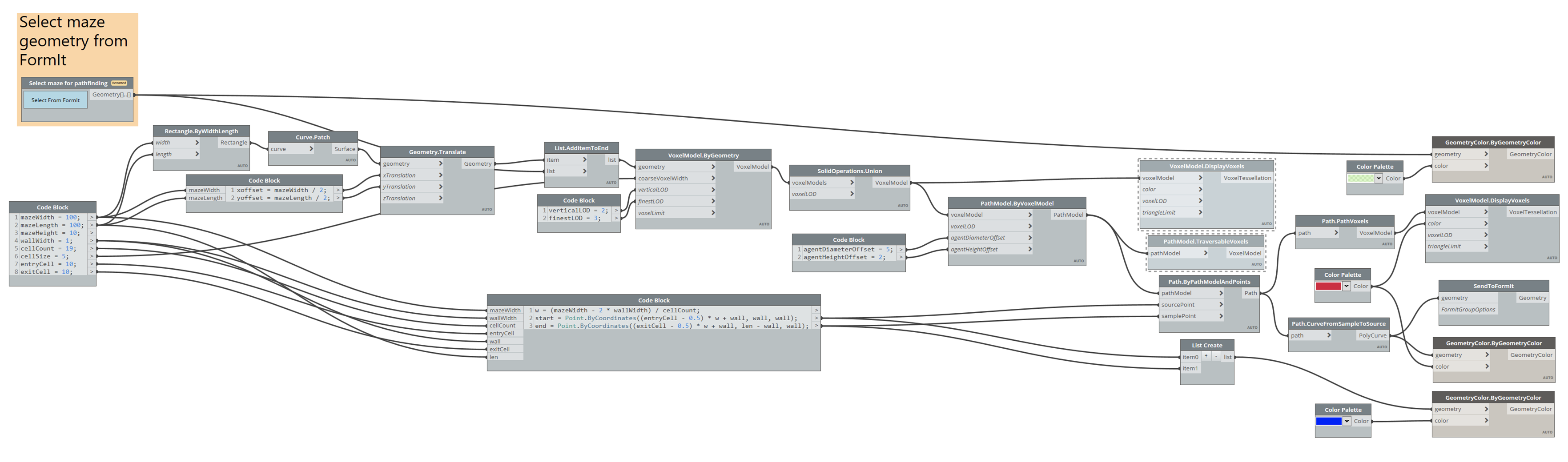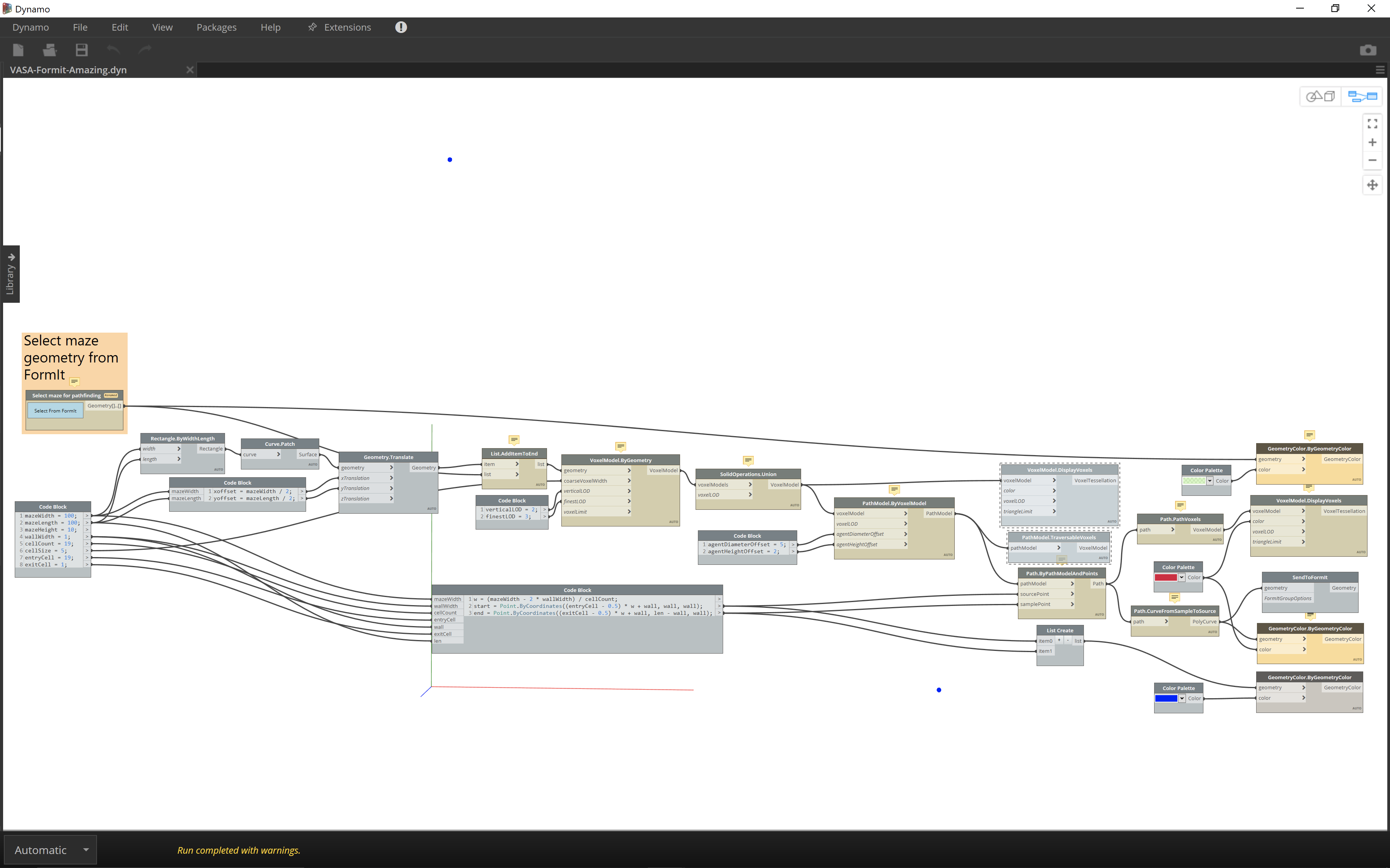 When I first started looking into VASA with FormIt, Rhys Goldstein sent across a Dynamo graph he'd used to grab contextual building geometry from FormIt – to create a voxel model of the space – and then send the pathfinding results back afterwards. I've adapted this graph to work with the results of the Maze Generator plugin.