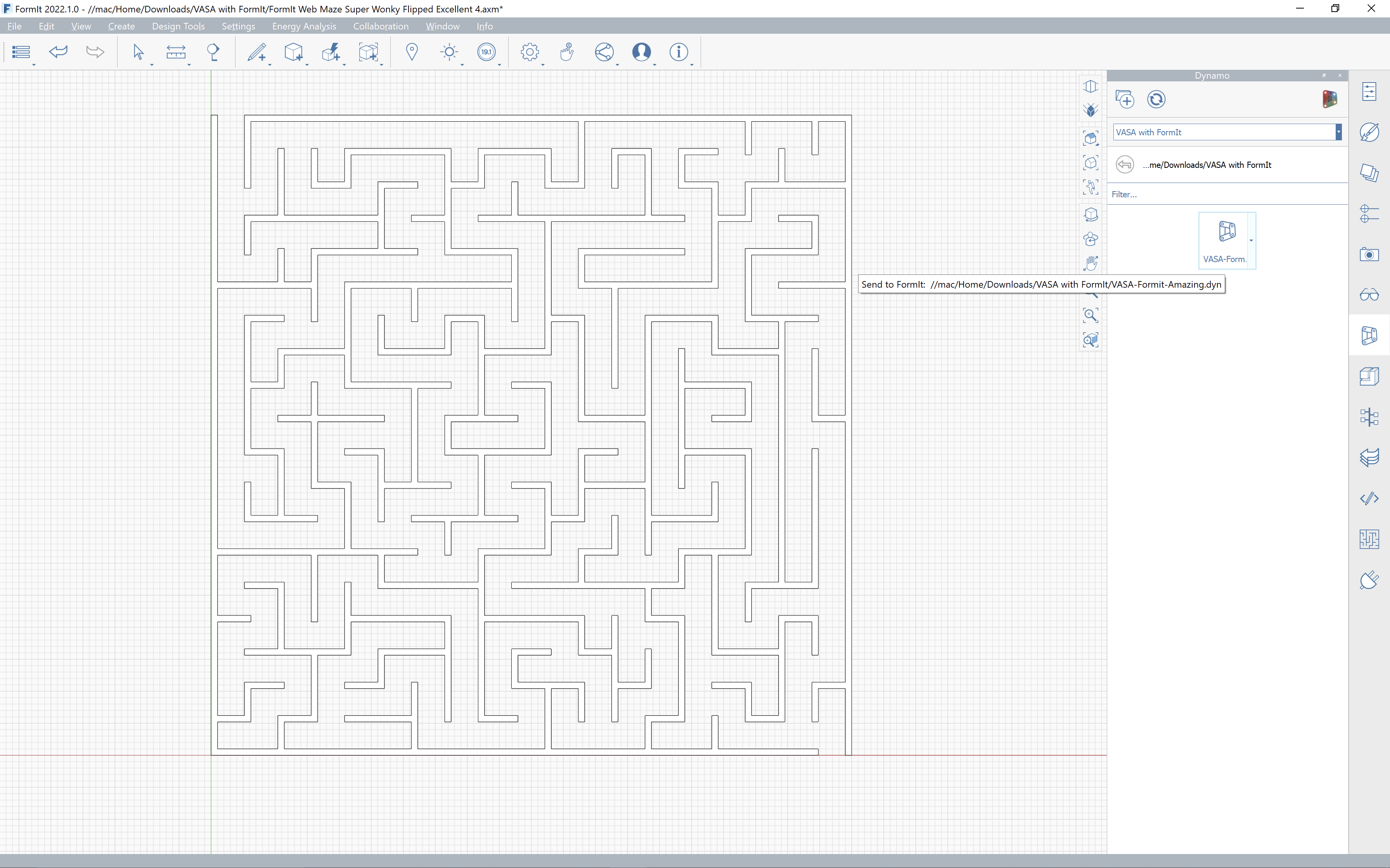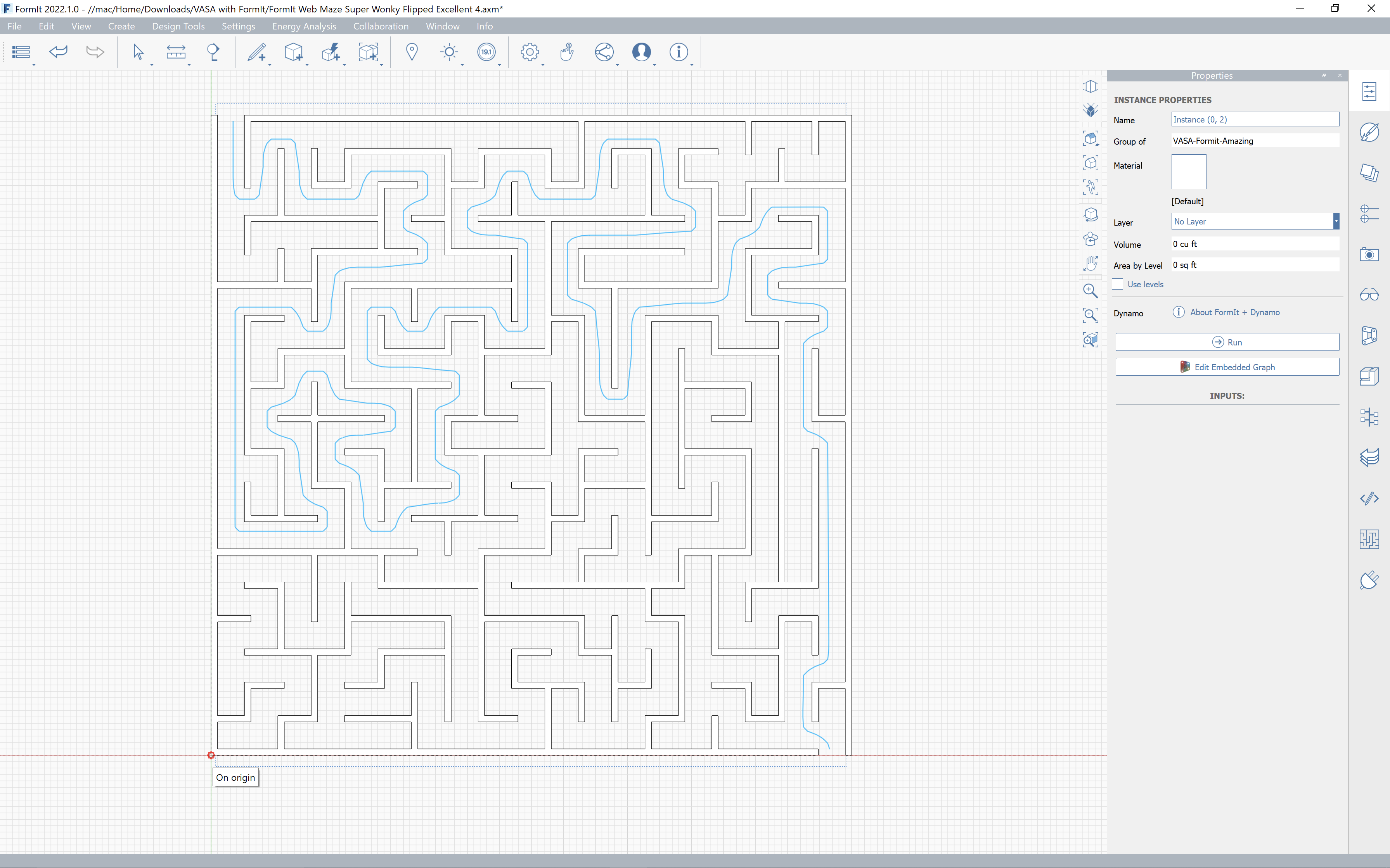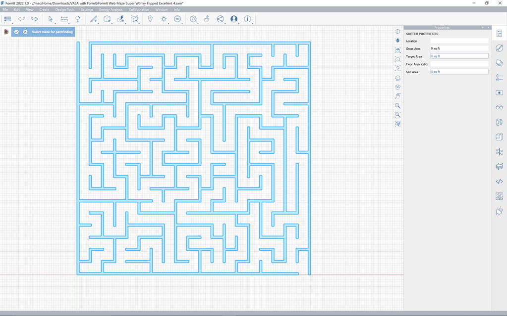 At which point selecting the origin will bring the path geometry into FormIt so that it matches the maze geometry. And solves it!