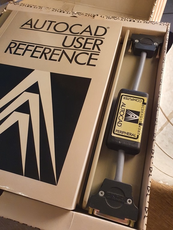 Inside the AutoCAD 2.5 box was a crazy hardware lock (also known as a dongle):