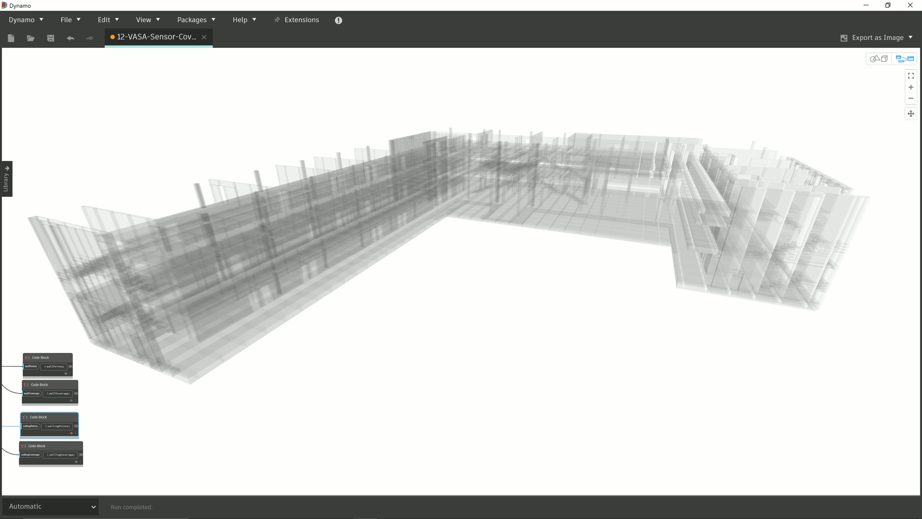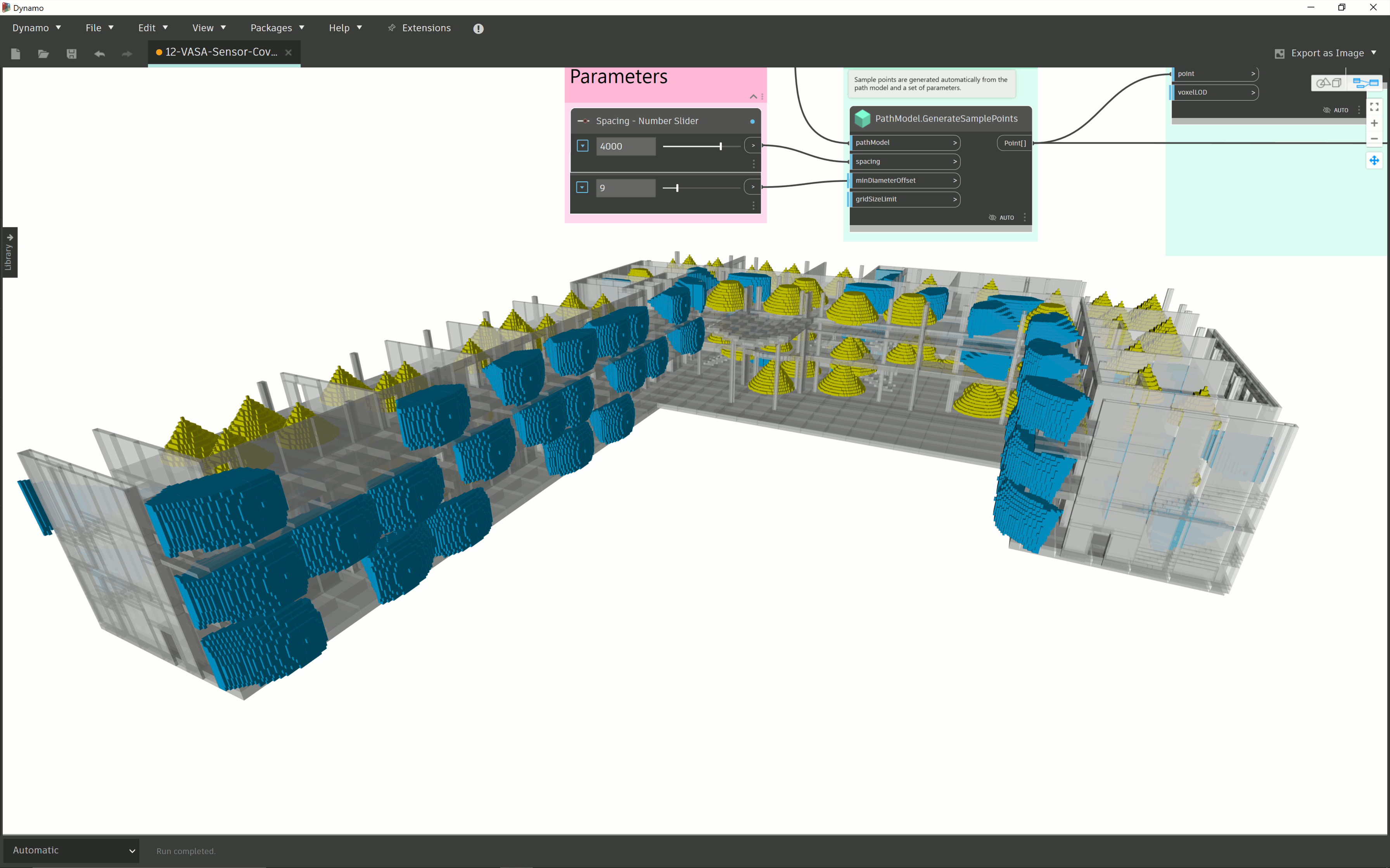 This sample seems ripe for use as part of a generative design workflow: the inputs to the graph that place sensors could be modified by the generative design feature inside Revit, while metrics could be introduced that  measure the effectiveness of the placement. VASA has ready-to-use nodes that can count the voxels in a voxel model, something that would give you a numeric assessment of relative coverage of a space by a set of sensors.