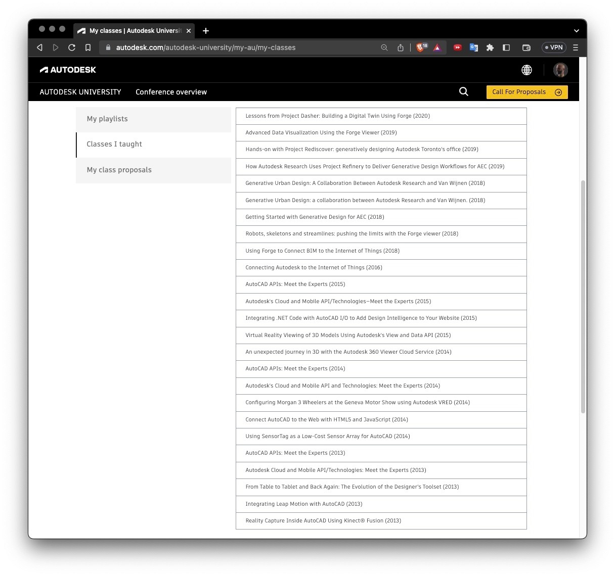 There's a fun tab in the "My AU" page that lists the classes you've taught, over the years, going back to 2013. My list contains a few I'd forgotten about (mainly classes I was involved in as a panelist or co-speaker). I'd love to see the list going back to the year 2000 (I think my that was probably my first AU), but it's still nostalgic to see the list from the last decade.