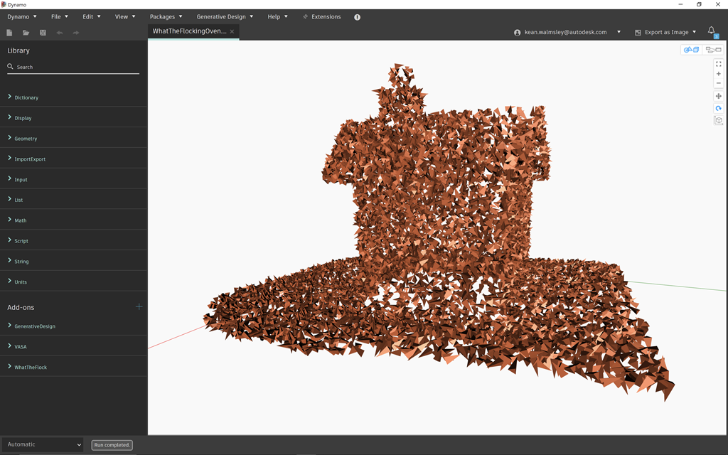 I was thrilled to see a post by Long Nguyen over the weekend announcing his publication of a Dynamo package called WhatTheFlock – with full source code – that implements a Boids-like flocking simulation. This work is significant not because ornithologists will use Dynamo to predict or simulate murmurations (although that in itself is a fun thought) but because Long has demonstrated a valuable technique that might be used to implement other arguably more useful types of multi-agent simulation inside Dynamo.