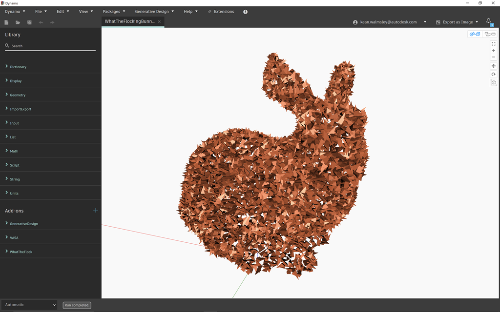 I dusted off some code that Rhys Goldstein had originally written to read in points from an ASCII-based PTS file (one of the simpler but least efficient point cloud formats) and used that to read in the initial locations from a classic sample point cloud of the Stanford bunny. I integrated this into the sample WhatTheFlock.dyn file Long provided with the package.