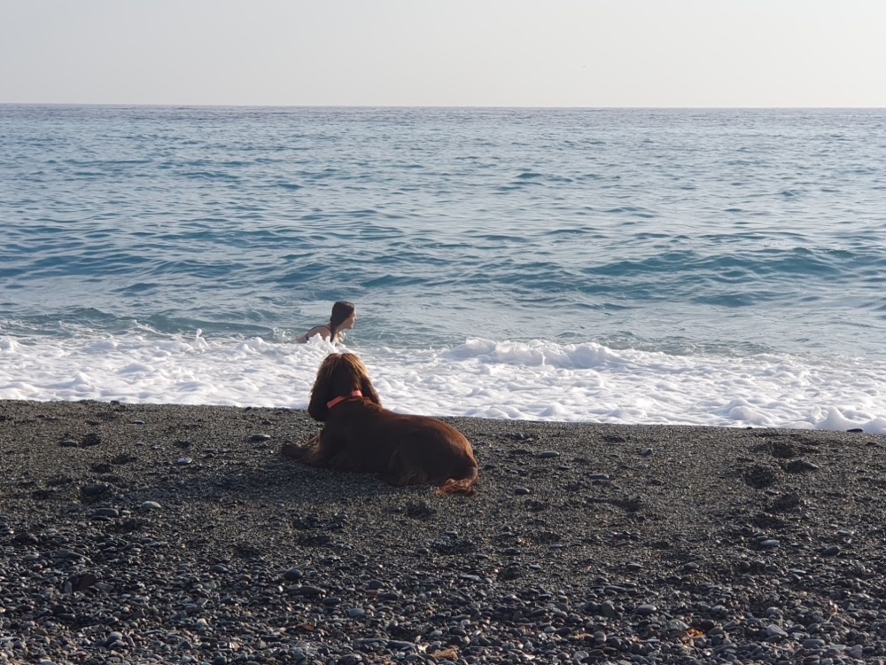 By the time we'd headed back to Riva Trigoso, the sky was less overcast and the waves were still a lot of fun for the kids to play in. Daisy was less ambitious, preferring to watch from the safety of the sand.