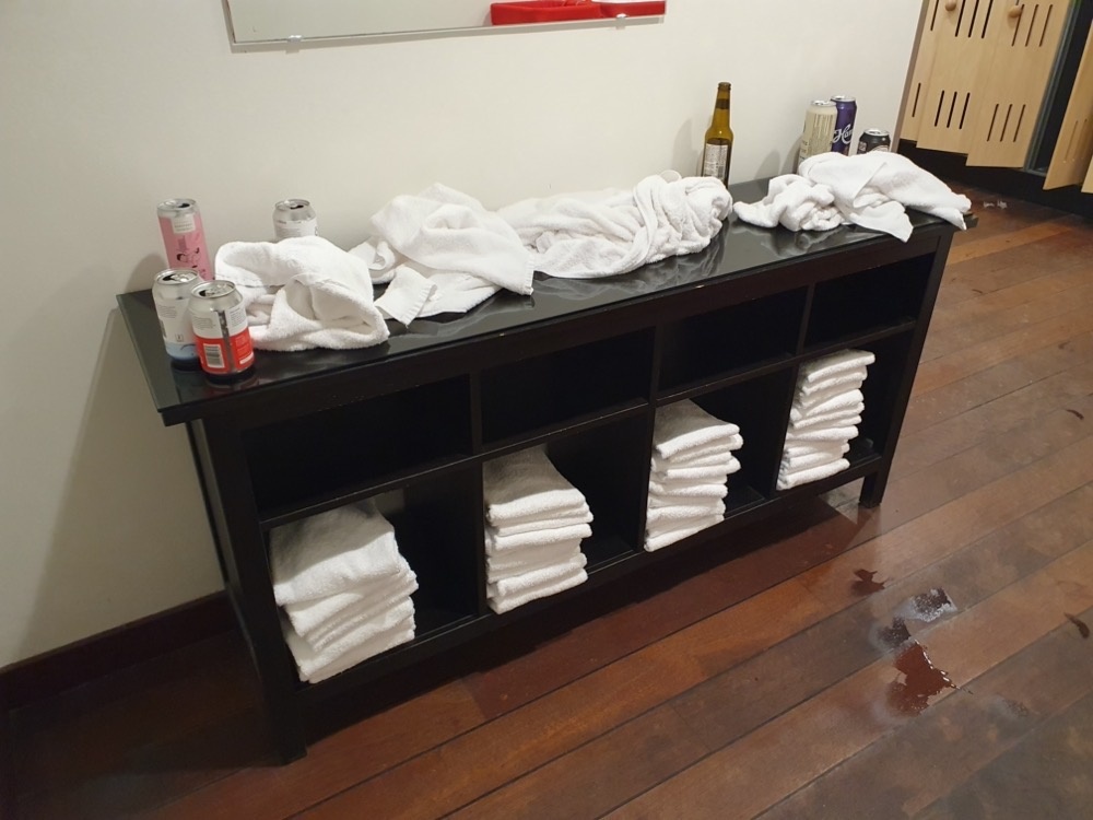 After a few more hours of hacking in the hotel room, I went to the hotel sauna for the last half hour. I had it to myself, but it's clear people had been making the most of it. This particular scene reminded me of a mid-winter sauna in the Swedish city of Borås, back in the day. If we ever have a drink together, be sure to ask for the story about the Swedish fireman convention. Good times.