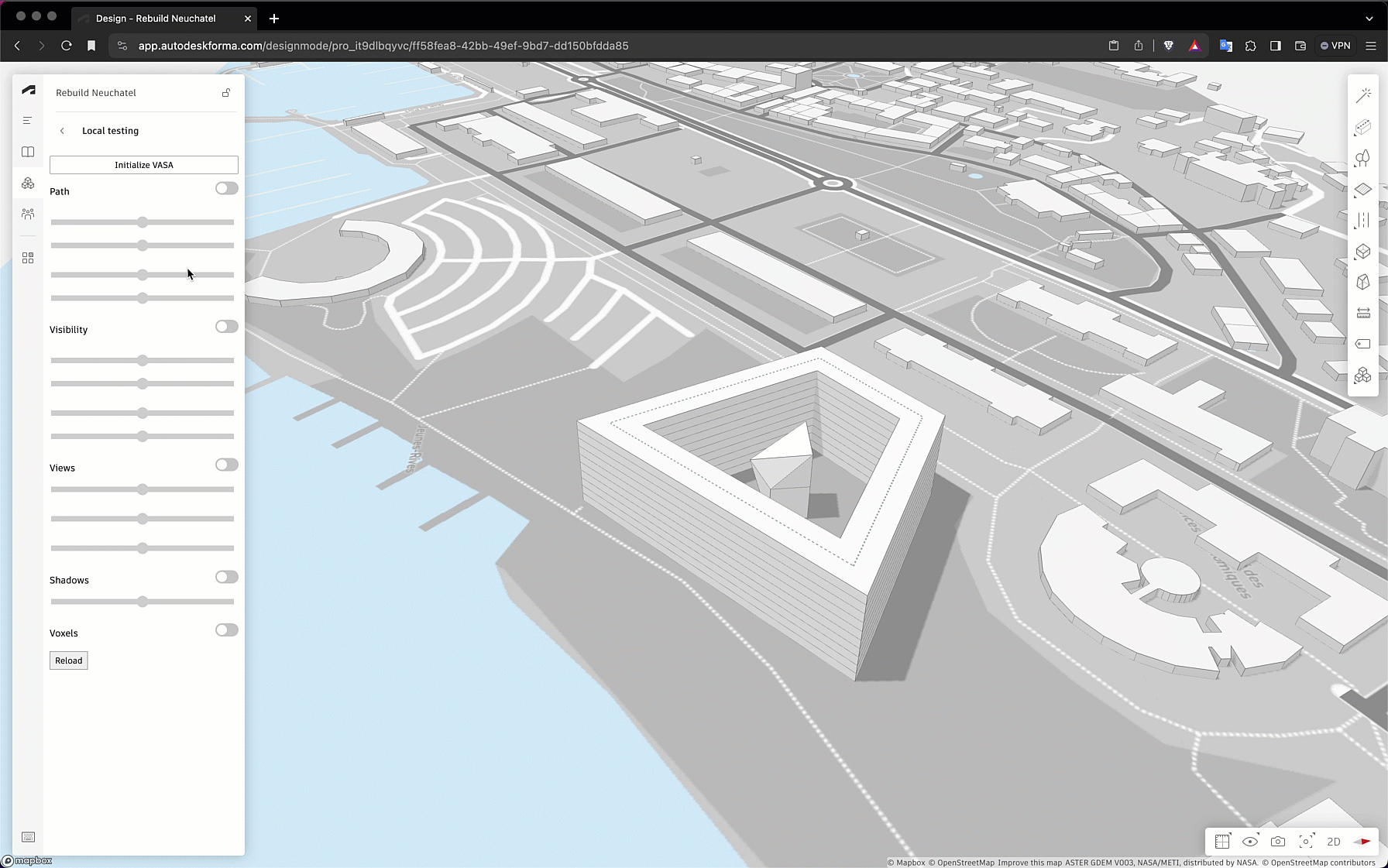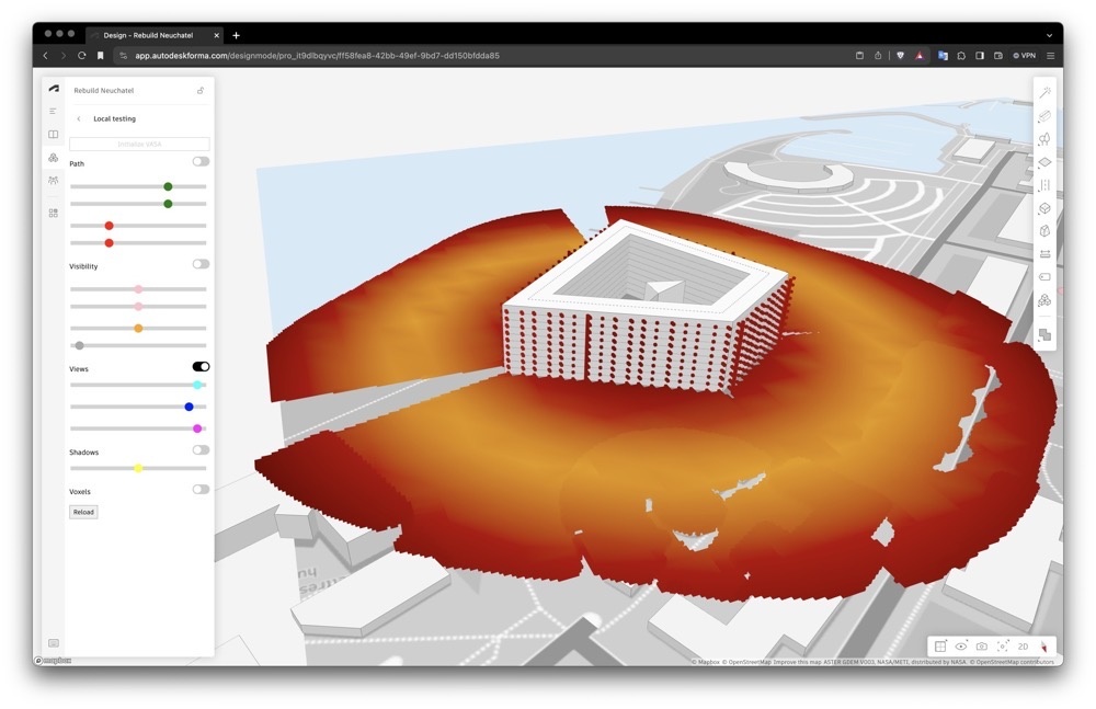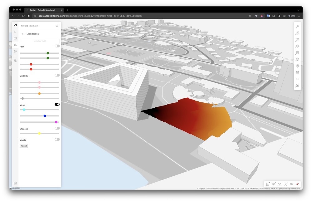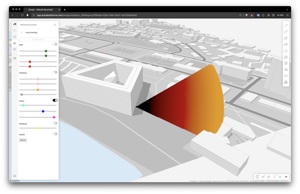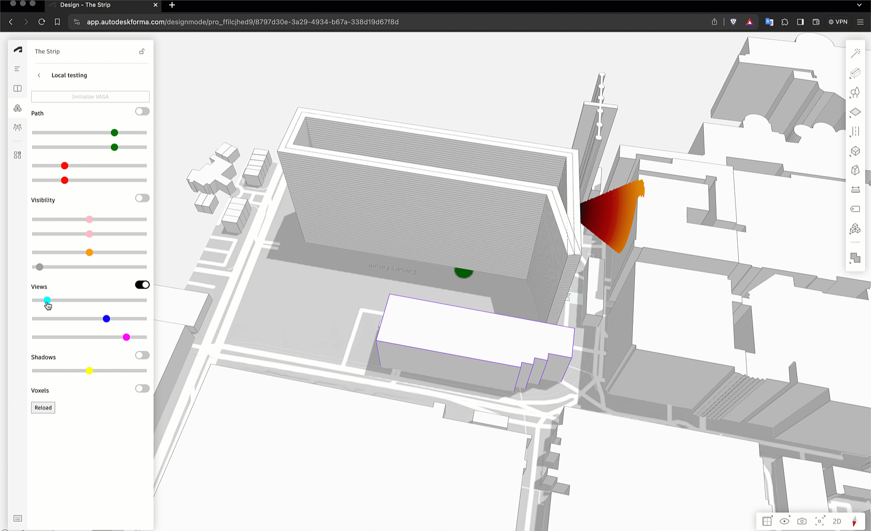 I found some time between meetings to work on the VASA inside Forma prototype. My goal for the week was to have the visibility cones displayed for our proposal building - something we saw in the last few posts - intersect with the surrounding geometry, whether other buildings or greenery of some kind.