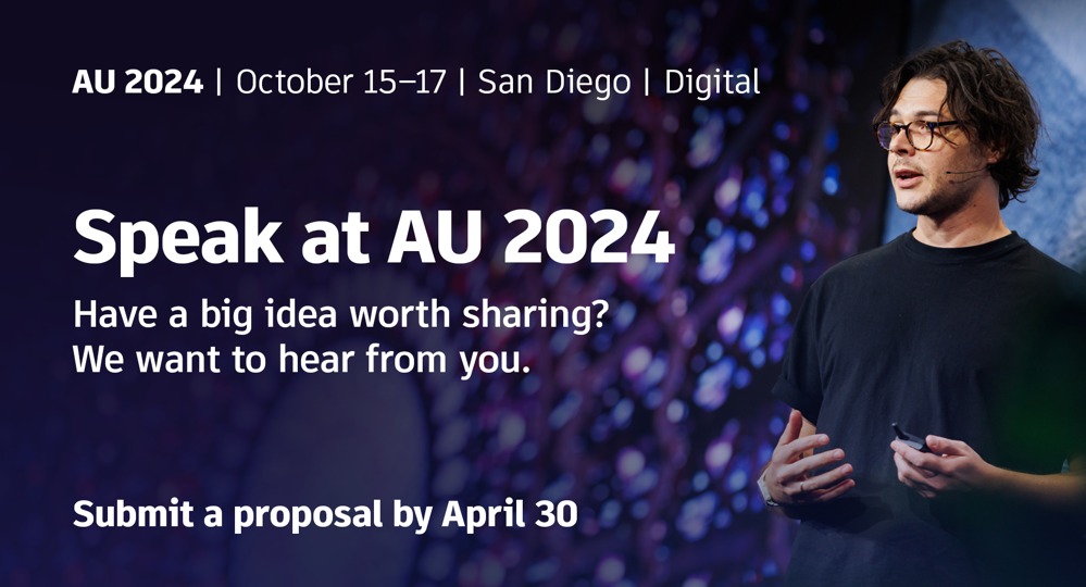 It's that time of year again: the Call for Proposals (CFP) for Autodesk University 2024 opened on April 2nd and will stay open until the end of the month (April 30th, 11:59 PM Pacific Time, to be precise).