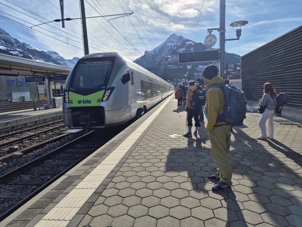 It's a big plus... it did snow overnight on Saturday. I was on the first lift up on Sunday and so got to make the most of the fresh snow accumulated on the pistes. Sheer joy.Fresh snow on the pistesMy flight on Sunday evening was at 6pm from Zurich, so I had to leave the slopes around noon to leave me enough time to get there, especially as over the weekends at the moment the train service between Zurich main station and the airport is disrupted by scheduled engineering work.The train in Frutigen