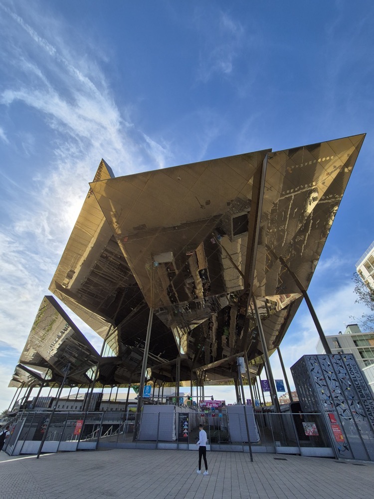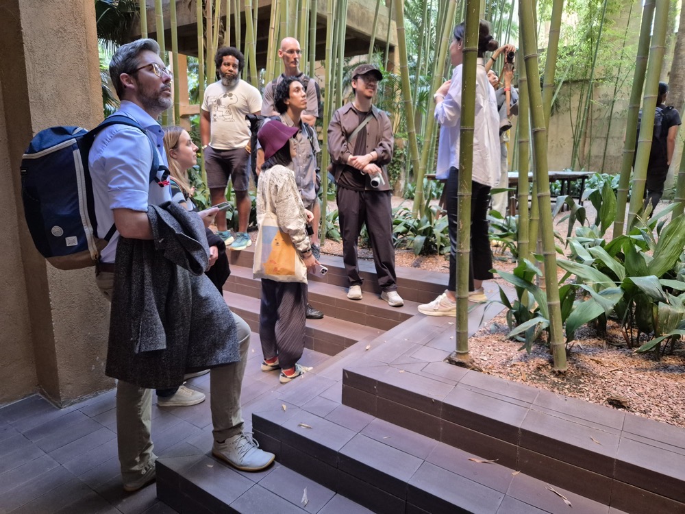 Our tour was at night, which meant the inside was artificially lit. The interior had a projection of water running down it. It was interesting to see the response of the team to this: the people focused on simulation and computer graphics were impressed by the precision of the mapping.